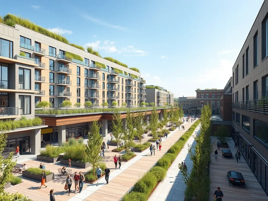 A mixed-use development combining residential, commercial, and green spaces, meeting top energy standards.